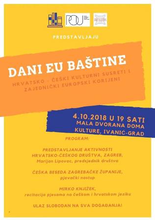 Hrvatsko-češko društvo sudjelovalo je 4. listopada 2018. na manifestaciji Hrvatsko-češki kulturni susreti i zajednički europski korijeni održanoj u Ivanić-Gradu na završetku programa obilježavanja Dana europske baštine koji je organizirala udruga Prijatelji baštine u suradnji s Pučkim otvorenim učilištem Ivanić-Grad. Cilj programa bio je predstaviti bogatu baštinu naroda i kulturnih raznolikosti europskoga kontinenta, uz potrebu njene zaštite i očuvanja.